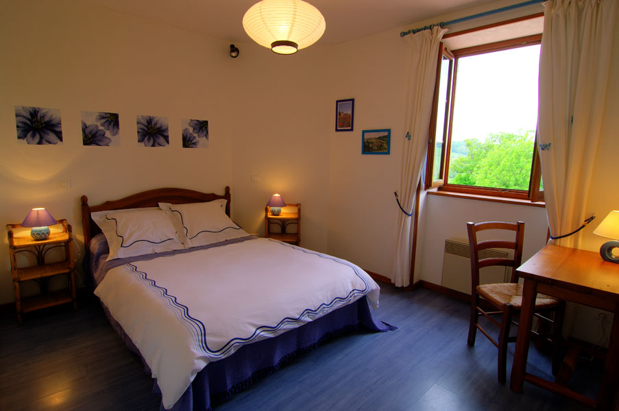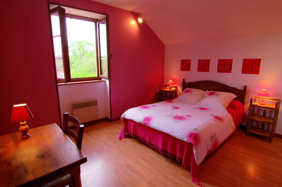 Ambiance jardin de roses pour cette chambre avec vue sur le village, elle peut être louée comme une suite familiale, elle est équipée d’un lit de 140 et peut accueillir 2 ou 4 personnes car elle communique avec un coin enfants comprenant 2 lits 1 personne, sanitaires privés (douche lavabo et WC séparés).
