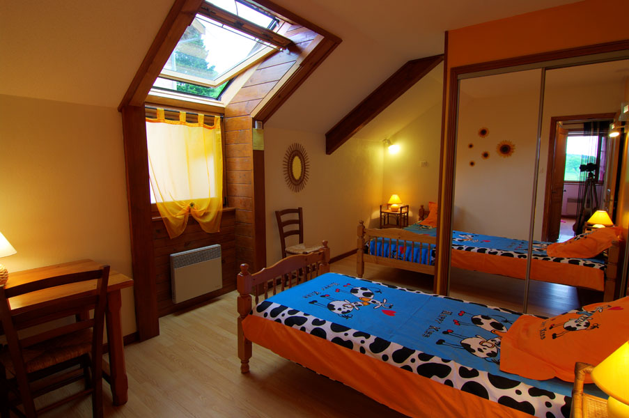 Avec un décor « vache » voici le coin enfants attenant à la chambre rose et comprenant 2 lits une personne.