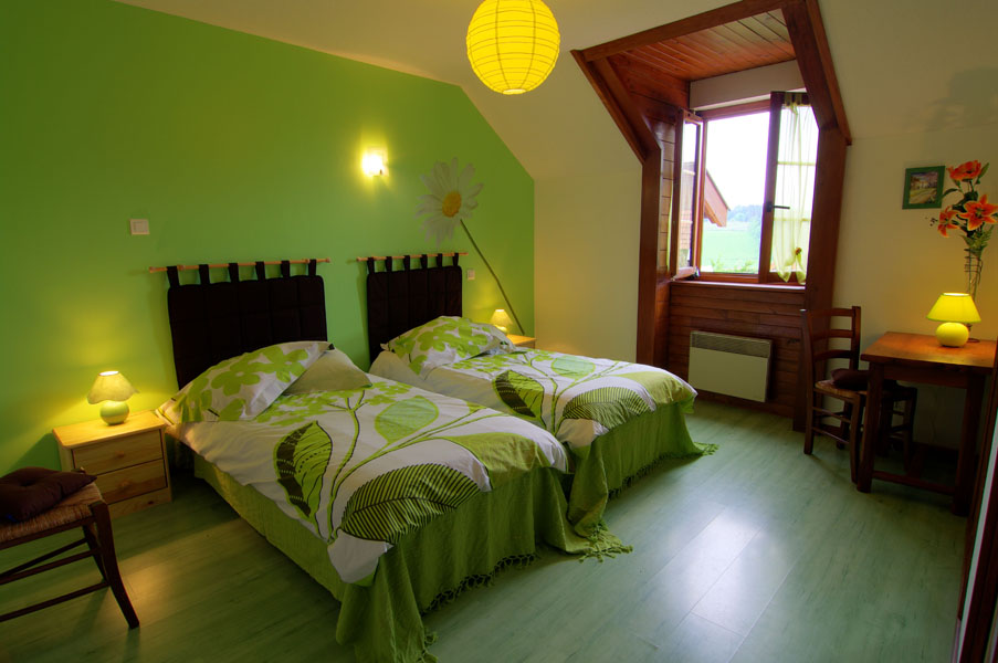 D’un vert vivifiant, un côté champêtre pour cette chambre 2 personnes avec lits séparés, elle est équipée de sanitaires privés (douche, lavabo et WC), vue sur la montagne de Dun.